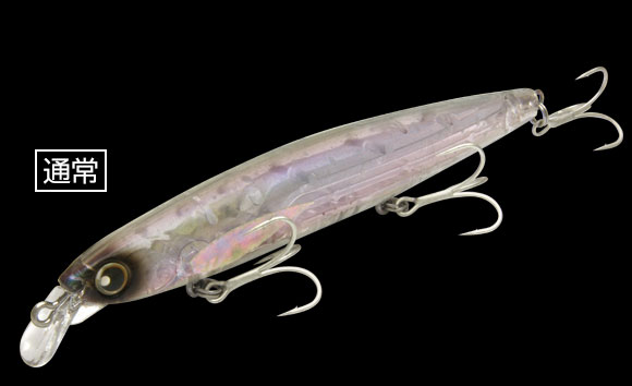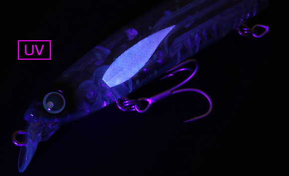 乱反射に最も強い無塗装の無垢のレンズホロを採用することで純粋な光の反射を強化、背と腹はクリアの上にラメを吹き付けて光を透過しながらもラメの反射を活かしました。 【❷蓄光時】 水の中で遠くまで届く青色の蓄光塗料を粒粒塗装することでローライトやナイトゲームでアピール力を高めました。 【❸アワビ】 古くから漁具に用いられているアワビ素材を採用、ヒレの形状にカットしたアワビの表面に紫外線発光塗料を施して最強のヒットポイントを作りだしました。 ![]() ![]() ![]() ![]()